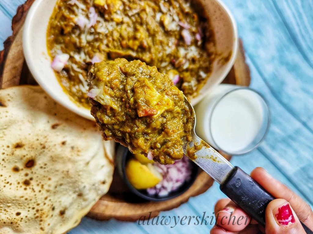 1) Boil green peas, french beans and potatoes together in a pressure cooker. After boiling mash it and keep it aside. In a bowl take enough water and bring it to boil. Once it boils add the palak, coriander leaves, ginger and garlic to this and let it boil for 2 minutes.